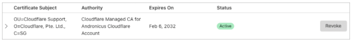 The following image displays an example of how a certificate with with Country Name, Organization Name, and Organizational Unit Name will look like on the Cloudflare dashboard: